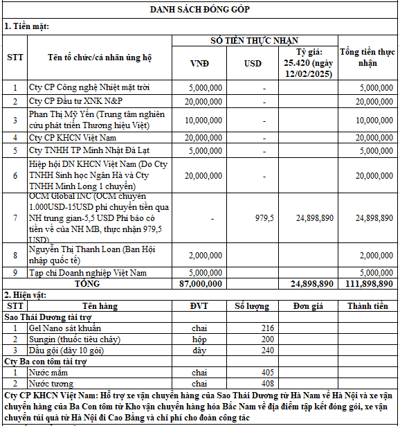 Quà tặng cho bà con ngoài phần tiền mặt do một số doanh nghiệp hội viên đóng góp còn là những sản phẩm khoa học công nghệ của các doanh nghiệp hội viên như nước mắm, nước tương của CTCP Công nghệ 3 Con Tôm; sản phẩm dược, hoá mỹ phẩm của CTCP Sao Thái Dương và các vật phẩm khác từ đóng góp của các hội viên trong hiệp hội.