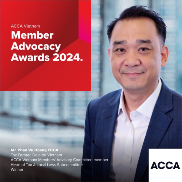 1. Ông Phan Vũ Hoàng, FCCA – Phó Tổng Giám đốc phụ trách Tư vấn Thuế tại Deloitte Việt Nam. Với hơn 30 năm kinh nghiệm, ông Hoàng là chuyên gia đồng hành cùng nhiều tập đoàn lớn giải quyết các thách thức thuế phức tạp. Ông cũng là Thành viên Ủy ban Cố vấn Hội viên ACCA và Trưởng ban Chuyên môn Thuế & Pháp lý của ACCA Việt Nam, người đã được vinh danh là ACCA Vietnam Advocate of the Year 2024.