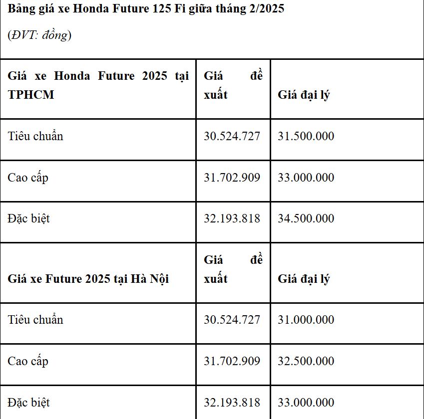 Cách đây không lâu, Honda đã ra mắt Future 125 FI 2025 mới tại Việt Nam. Xe được phân phối với 3 phiên bản Tiêu chuẩn, Cao cấp và Đặc biệt cùng mức giá lần lượt là 30,5 triệu, 31,7 triệu và 32,2 triệu đồng. Không lâu sau khi bán chính thức, mẫu xe số này đã được các đại lý ưu đãi hàng triệu đồng.