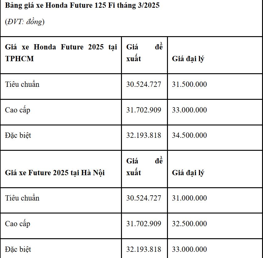 Cách đây không lâu, Honda đã ra mắt Future 125 FI 2025 mới tại Việt Nam. Xe được phân phối với 3 phiên bản Tiêu chuẩn, Cao cấp và Đặc biệt cùng mức giá lần lượt là 30,5 triệu, 31,7 triệu và 32,2 triệu đồng. Không lâu sau khi bán chính thức, mẫu xe số này đã được các đại lý ưu đãi hàng triệu đồng.