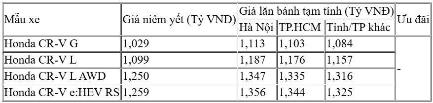 Giá niêm yết và lăn bánh tạm tính xe Honda CR-V cập nhật tháng 2/2025: