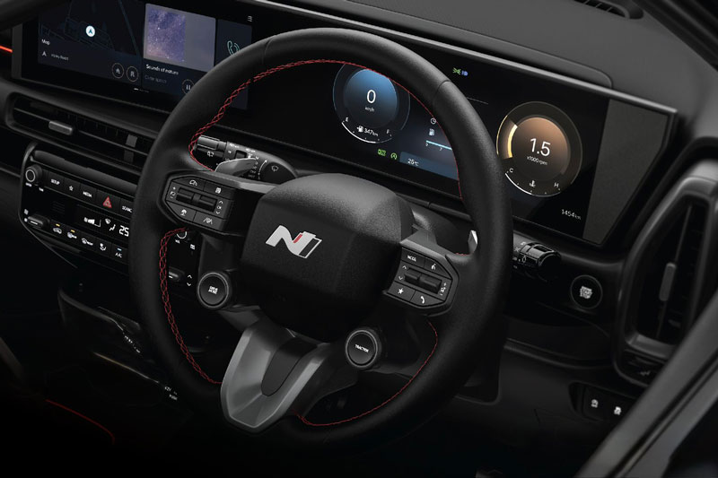 Khoang nội thất của Hyundai Venue N Line 2026 được hoàn thiện với phong cách thể thao đặc trưng, sử dụng tông màu đen chủ đạo kết hợp đường chỉ đỏ tương phản. Vô lăng lấy cảm hứng từ mẫu Ioniq 5 N, tích hợp lẫy chuyển số và núm xoay điều chỉnh chế độ lái, mang lại cảm giác điều khiển phấn khích hơn. Logo N xuất hiện trên ghế da và cần số, cùng bàn đạp kim loại và hệ thống đèn viền nội thất 64 màu, giúp tạo không gian lái đầy cảm hứng.