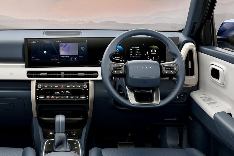 Bước vào khoang lái, Hyundai Venue 2026 gây ấn tượng với màn hình cong toàn cảnh gồm hai màn hình 12,3 inch tích hợp bảng đồng hồ kỹ thuật số và màn hình giải trí trung tâm. Thiết kế bảng điều khiển được làm mới hoàn toàn với các khe gió điều hòa hiện đại, dòng chữ Venue nổi bật và cụm điều khiển trung tâm được bố trí gọn gàng nhưng vẫn giữ lại các nút vật lý cho hệ thống điều hòa.