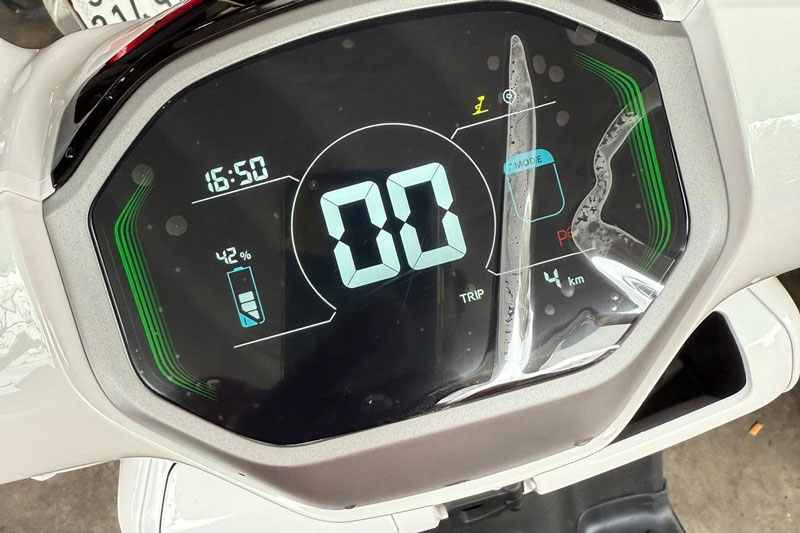 Xe được trang bị màn hình màu hiển thị các thông số cơ bản như vận tốc, dung lượng pin, hỗ trợ kết nối bluetooth hoặc kết nối với ứng dụng Yadea. Ở tay lái bên trái là cụm điều khiển đèn pha/cos, kèn báo hiệu, trong khi tay lái bên phải tích hợp thêm nút đèn Hazard – một điểm cộng cực chất cho những chuyến đi xa.
