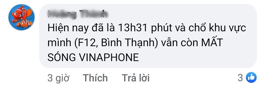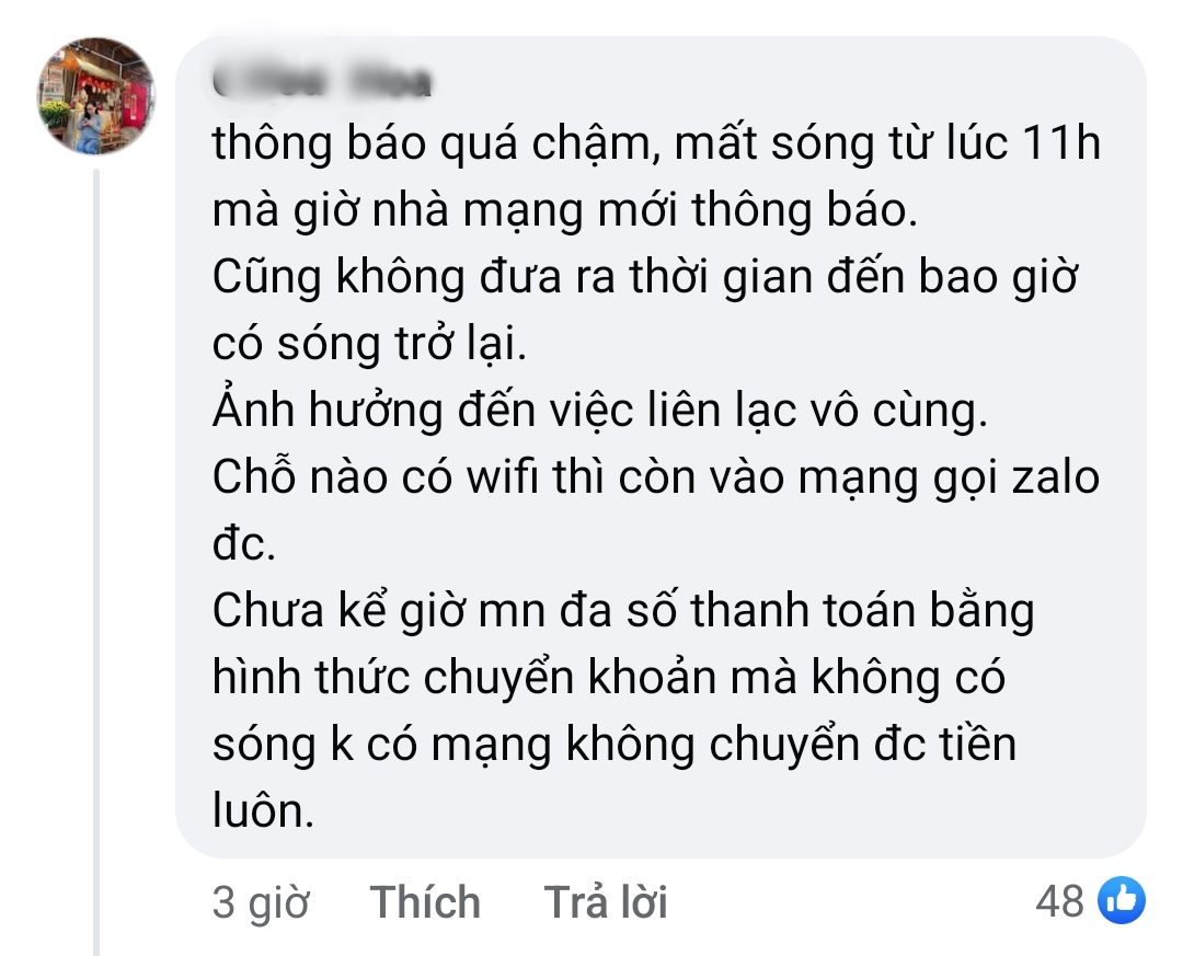"Thông báo quá chậm, mất sóng từ 11h mà giờ nhà mạng mới thông báo", tài khoản Q.H bày tỏ bức xúc trên fanpage VinaPhone.