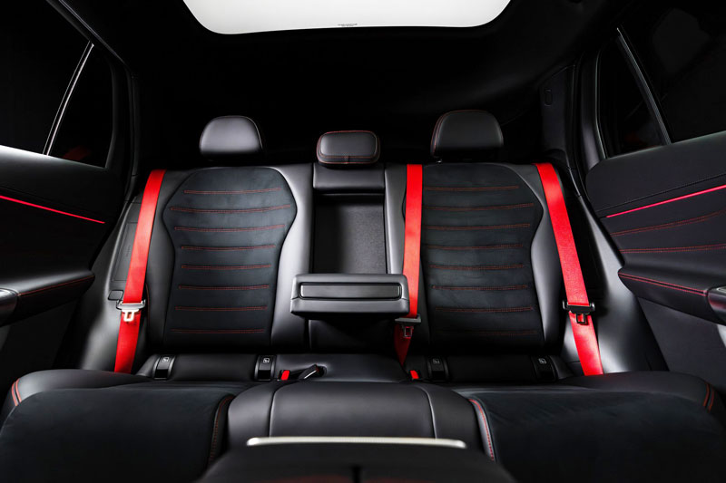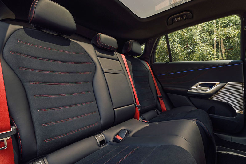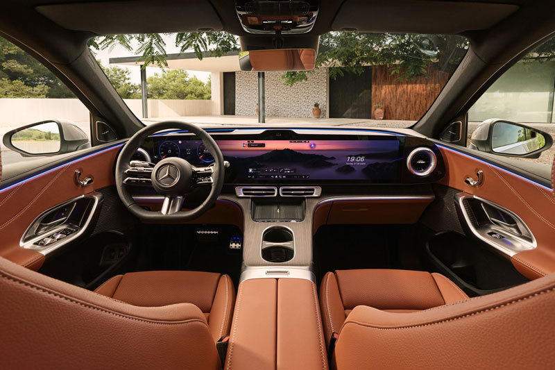 Nội thất được bổ sung hệ thống đèn viền tinh xảo, thậm chí có thể tích hợp vào cửa sổ trời toàn cảnh bằng kính. Bố trí các cửa gió điều hòa hình tròn và hình chữ nhật cùng bảng điều khiển trung tâm nổi tối giản, tích hợp hai khay đựng cốc và sạc điện thoại không dây kép, thể hiện sự sang trọng và tinh tế đặc trưng của Mercedes-Benz.