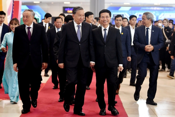 Tổng Bí thư Tô Lâm, Phó Thủ tướng thường trực Chính phủ Nguyễn Hòa Bình và Bộ trưởng TT&TT Nguyễn Mạnh Hùng tham quan khu triển lãm tại diễn đàn quốc gia về doanh nghiệp công nghệ số Việt Nam. (Ảnh: Vietnamnet).