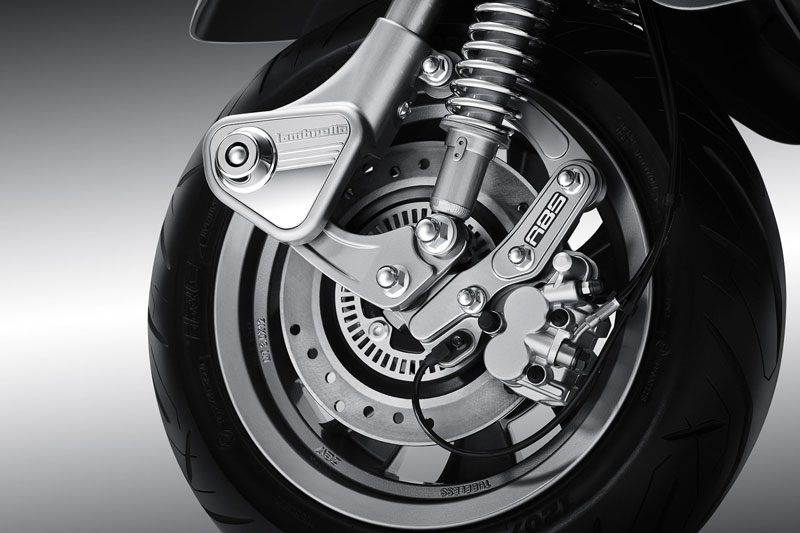Lambretta X300 sử dụng mâm đúc đa chấu 12 inch ở cả hai bánh, đi kèm lốp không săm giúp di chuyển êm ái và an toàn hơn. Hệ thống phanh đĩa tích hợp ABS hai kênh là điểm cộng cực lớn cho cảm giác lái ổn định và an toàn trong mọi tình huống, kể cả khi phanh gấp.