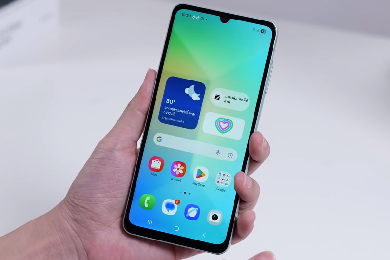 Galaxy A06 5G sở hữu tấm nền màn hình LCD PLS kích thước 6,7 inch với độ phân giải 720 x 1.600 pixel (tỷ lệ 20:9). So với phiên bản A06 4G, mẫu 5G được nâng cấp tốc độ làm tươi lên 90Hz, mang lại trải nghiệm vuốt chạm mượt mà hơn. Một điểm mới đáng chú ý trên phiên bản này là cảm biến vân tay được tích hợp bên cạnh hông máy, giúp mở khóa nhanh chóng và tiện lợi.