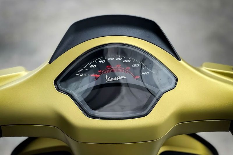 Một nâng cấp “xịn sò” khác là cụm đồng hồ hoàn toàn mới: màn hình LCD 3 inch kết hợp analog hiển thị tốc độ. Đồng hồ này hỗ trợ kết nối với điện thoại qua ứng dụng Vespa MIA, cho phép bạn nhận thông báo cuộc gọi, tin nhắn ngay trên màn hình xe.
