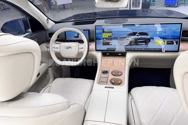 Bên trong cabin, Chery thực sự chơi lớn khi trang bị màn hình đôi kích thước khủng lên đến 30 inch, kéo dài từ trung tâm sang ghế phụ lái trông cực công nghệ và cực đã mắt. Xe có cụm đồng hồ kỹ thuật số và hỗ trợ ra lệnh giọng nói AI cho cả sáu ghế ngồi. Ngoài ra, còn có HUD (hiển thị thông tin trên kính lái) và hàng loạt tiện nghi hiện đại khác.