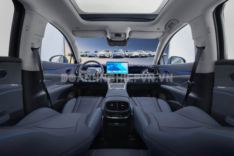 Nội thất của mẫu SUV này tiếp tục theo đuổi phong cách đại dương với bảng điều khiển mang tên "Ice World" thiết kế đối xứng độc đáo. Điểm nhấn chính là màn hình trung tâm nổi kích thước lớn 15,6 inch kết hợp cùng cụm đồng hồ kỹ thuật số 10,25 inch, tạo nên không gian vừa công nghệ vừa thanh lịch. Xe còn được trang bị tủ lạnh mini đa năng có thể làm lạnh tới -6°C và làm nóng tới 50°C – một chi tiết cực "chill" cho những chuyến đi xa. Ghế ngồi trước sau đều có chức năng sưởi và làm mát, riêng ghế trước có thêm tính năng massage, quá chuẩn cho những ai thích sự thoải mái khi lái xe.