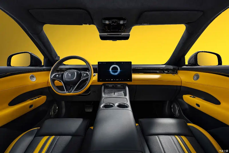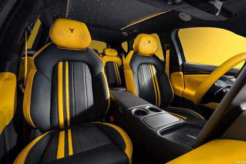 Khoang nội thất của Voyah Free+ Sport Custom Edition tiếp tục khẳng định đẳng cấp sang trọng với phong cách phối hai tông màu vàng - đen độc đáo, điểm xuyết những chi tiết sợi carbon mờ tinh tế. Ghế da Nappa cao cấp mang lại cảm giác êm ái, đồng thời người dùng có thể tùy chọn trang bị mái vòm bầu trời sao thông minh, hỗ trợ điều khiển bằng giọng nói.
