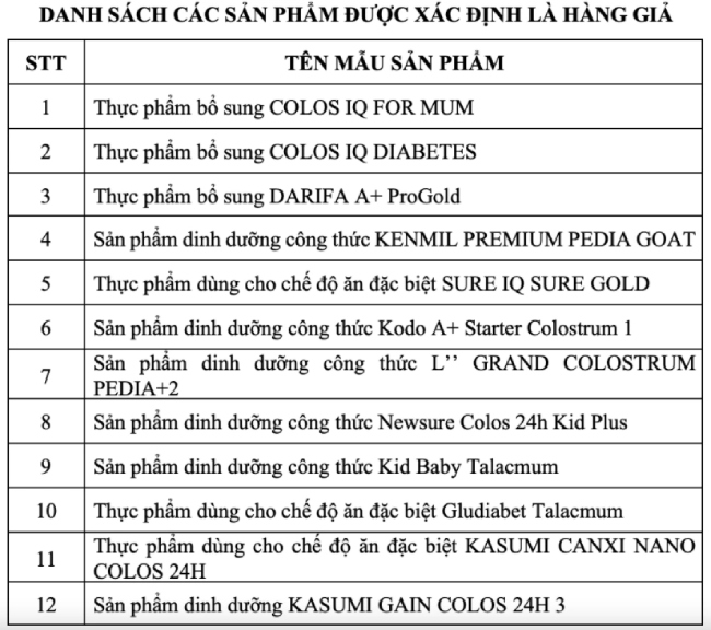 Danh sách 12 sản phẩm thực phẩm, dinh dưỡng (dạng sữa bột) là hàng giả kèm theo công văn số 1095/VPCQCSĐT- P3 ngày 22/4/2025 của Cơ quan Cảnh sát điều tra Bộ Công an.