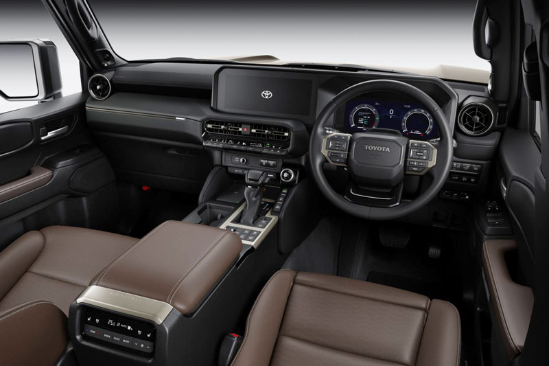 Nội thất của Toyota Land Cruiser 250 2026 được trang bị màn hình giải trí 12,3 inch, bảng đồng hồ kỹ thuật số 12,3 inch (tùy phiên bản), hệ thống âm thanh 10 loa hoặc JBL 14 loa cao cấp, sạc không dây, cửa sổ trời chỉnh điện và ghế da cao cấp có sưởi/thông gió.