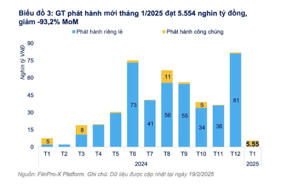 Trong đó, tổng giá trị phát hành mới đạt 5,55 nghìn tỷ đồng trong tháng 1/2025, giảm mạnh 93,2% so với tháng trước và giảm 27% so với cùng kỳ do phần nào chịu ảnh hưởng bởi kỳ nghỉ Tết Nguyên đán kéo dài một tuần từ 25-31/1/2025.