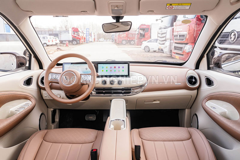 Bên trong khoang cabin, Wuling Bingo 2025 khiến người ta “ưng bụng” ngay từ cái nhìn đầu tiên với cụm màn hình đôi 10,25 inch gồm đồng hồ kỹ thuật số và màn hình trung tâm cảm ứng, kết hợp vô-lăng hai chấu đa chức năng và cần số tay gọn gàng. Không gian nội thất nổi bật với cách phối màu trẻ trung nâu hạt dẻ và cà phê caramel mang lại cảm giác ấm áp, gần gũi nhưng vẫn thời thượng. Bảng điều khiển trung tâm được ốp nhiều lớp màu sắc, có bệ tỳ tay tích hợp hộc chứa đồ và giá để cốc tiện dụng không chỉ đẹp mà còn rất thực tế.
